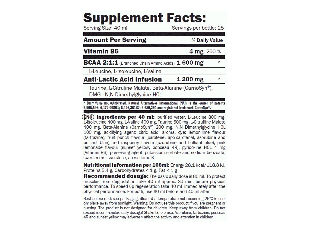 V 80 ml: Čištěná voda, L-leucin 1600 mg, taurin 1000 mg, L-isoleucin 800 mg, L-valin 800 mg, L-citrulin Malát 800 mg, Beta-alanin (CarnoSyn®) 400 mg, N dimethylglycine HCl 200 mg, regulátor kyselosti: kyselina citronová, aroma, barviva: tartrazin (příchuť citrón-limetka), karoten, beta-apo-8´-carotenal, azorubín a brilantní modř (příchuť fruit punch), azorubín a brilantní modř (příchuť malina), žluť SY a košenila červená (příchuť růžová limonáda), Pyridoxin HCL 8 mg (vitamín B6 – 571 %*), konzervant: sorban draselný a benzoan sodný, sladidla: sukralosa, acesulfam-K. *RHP - Referenční hodnota příjmu