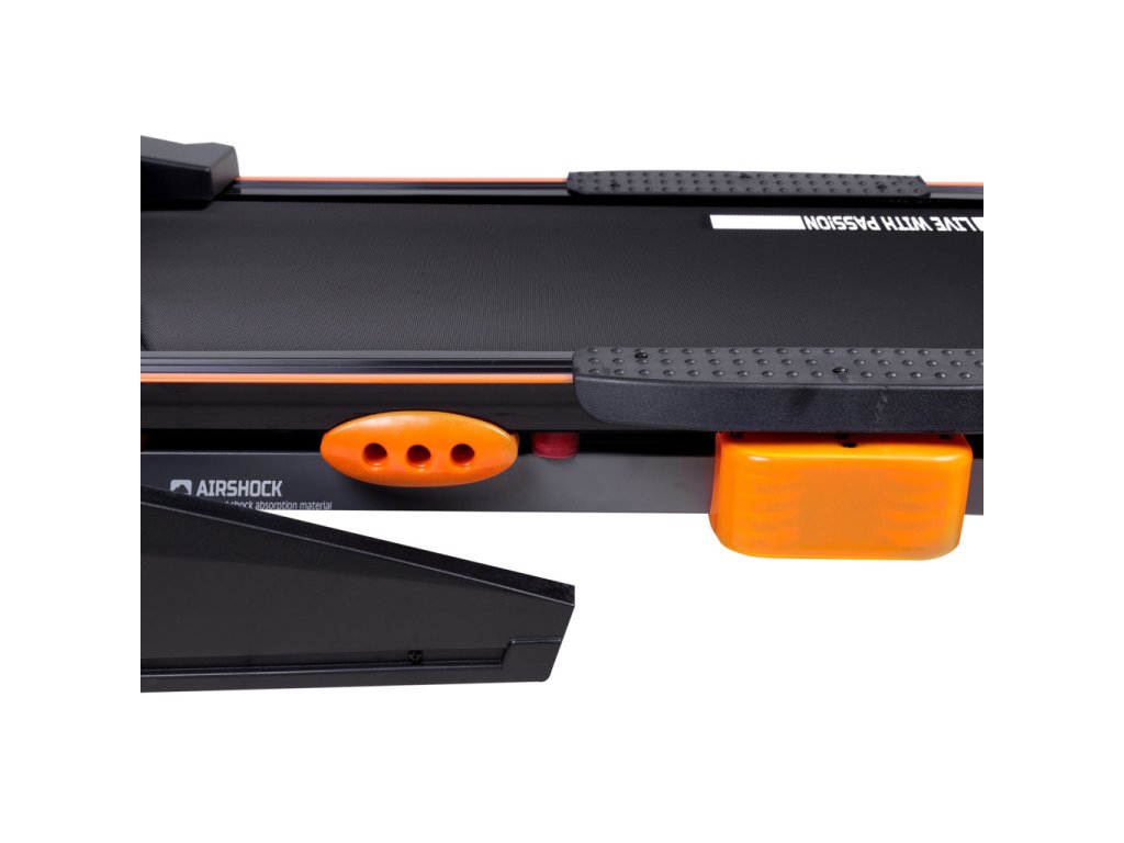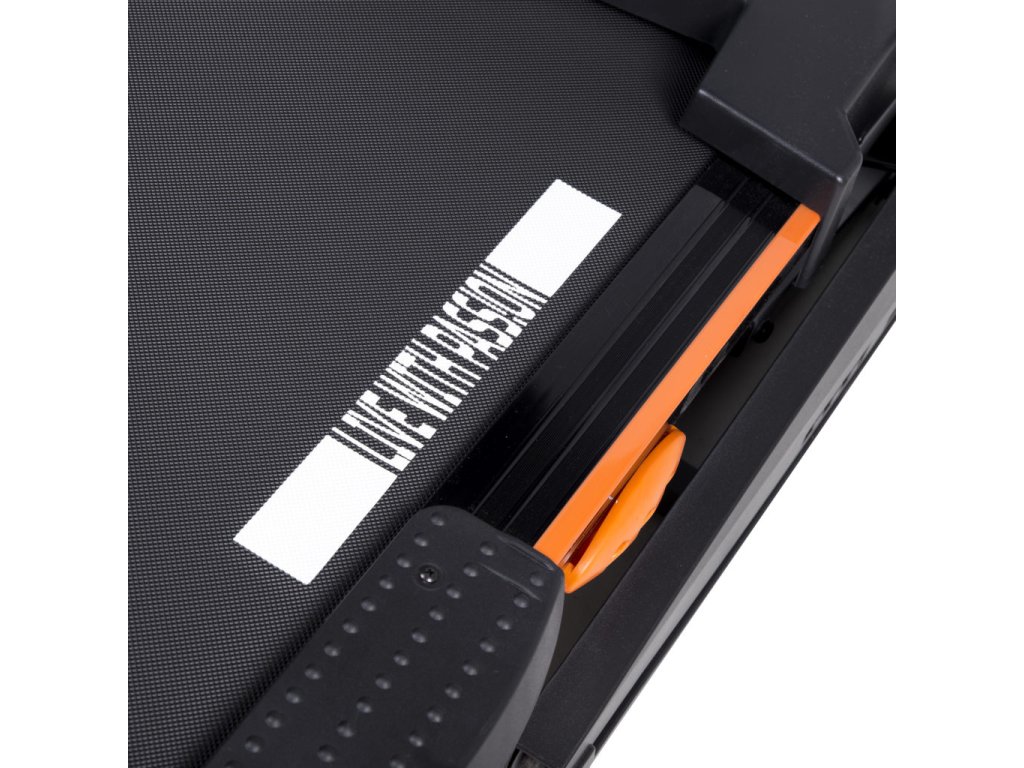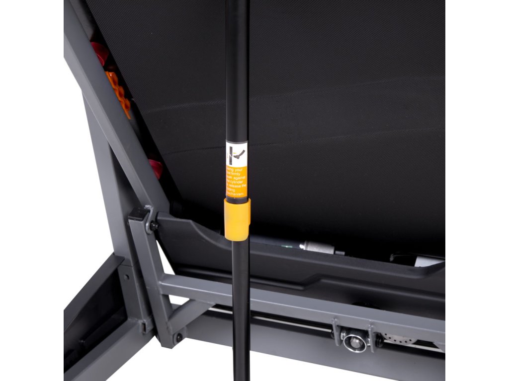 Když běžecký pás zrovna nepoužíváte, můžete jej jednoduše složit, čímž zabere méně místa. Opětovné rozložení je velmi jednoduché. Stačí nohou stisknout na barevný prvek hydraulického válce a opatrně zatáhnout pás dolů – běžecký pás se rozloží sám.