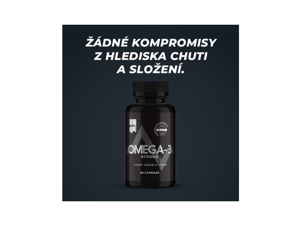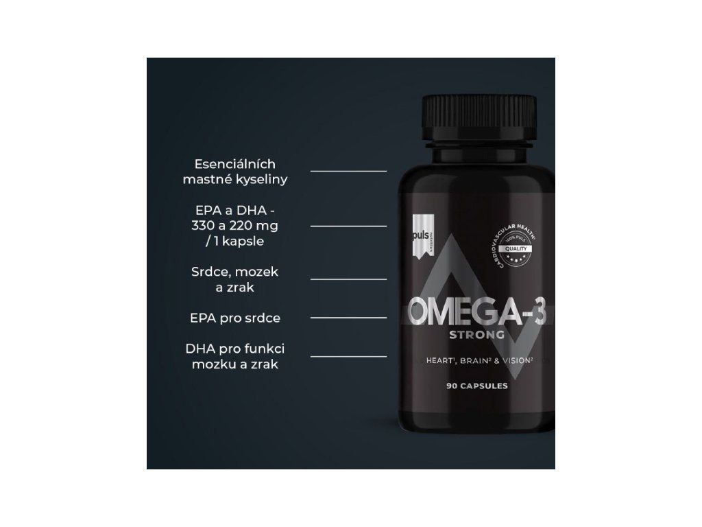 Omega 3 Strong od PULS NUTRITION představuje kvalitní doplněk stravy s obsahem esenciálních omega 3 mastných kyselin, které jsou důležitou součástí vyváženého jídelníčku. Každá kapsle obsahuje 1000 mg rybího oleje s vysokým podílem EPA (330 mg) a DHA (220 mg), tedy klíčových mastných kyselin, které mají význam pro správné fungování organismu.