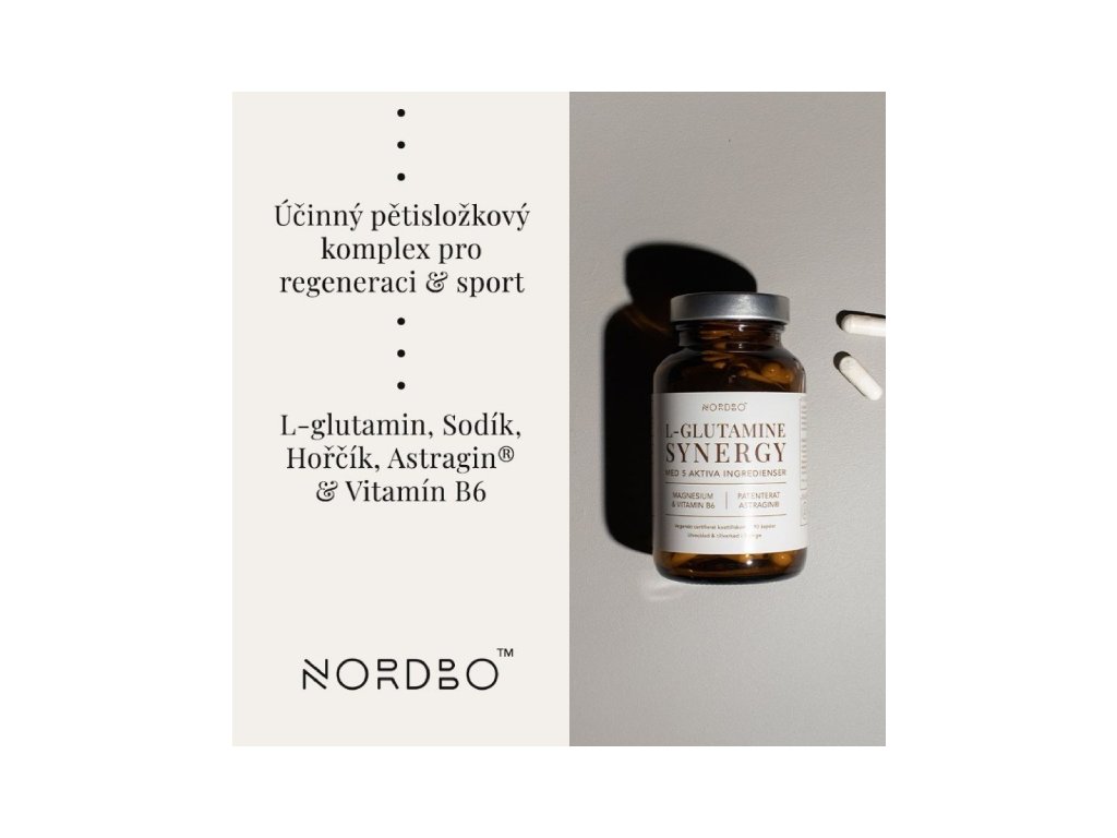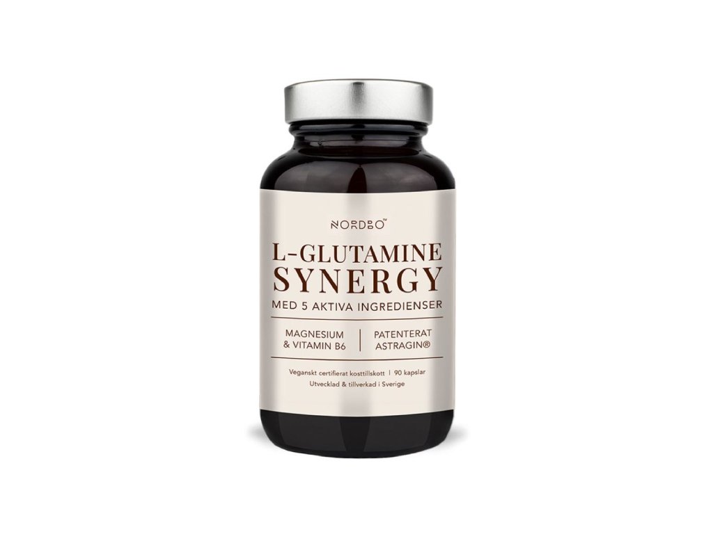 L-Glutamine Synergy je synergicky sestavený komplex obsahující L-glutamin, hořčík ve formě bisglycinátu, mořskou sůl Le Guérandais, vitamín B6 a patentovaný extrakt AstraGin®. L-glutamin je nejhojněji zastoupená aminokyselina v lidském těle. Hořčík přispívá k normální činnosti svalů, rovnováze elektrolytů a ke snížení únavy a vyčerpání. Mořská sůl Le Guérandais® pochází z francouzské Bretaně a jedná se o nebělenou a nerafinovanou mořskou sůl s přirozeným obsahem minerálů a stopových prvků. Vitamín B6 přispívá k normálnímu energetickému metabolismu. AstraGin® je patentovaný rostlinný extrakt z astragalu a ženšenu, u něhož bylo ve studiích prokázáno, že podporuje vstřebávání aminokyselin.