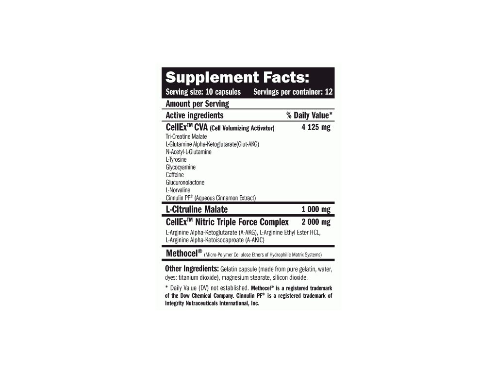 Želatinová kapsle (želatina, voda, barvivo oxid titaničitý), Tri-Kreatin Malát 1200 mg, L-Glutamin Alfa-Ketoglutarát 1200 mg, L-Arginine-Alpha-Ketoglutarát 1000 mg, L-Citrulin malát 1000 mg, L-Arginin Ethylester hydrochlorid 800 mg, N-Acetyl-L-Glutamin 500 mg, L-Tyrosin 500 mg, stabilizátor: hydroxypropylmethylcelulosa Methocel®, látka protispékavá: stearát hořečnatý, Glycocyamin 200 mg, kofein 200 mg, L-Arginin-Alfa-Ketiosokapronát 200 mg, Glucuronolacton 125 mg, L-Norvalin-2-aminovalerová kyselina 100 mg, skořicový extrakt /Cinnulin®/ 100 mg, látka protispékavá: oxid křemičitý